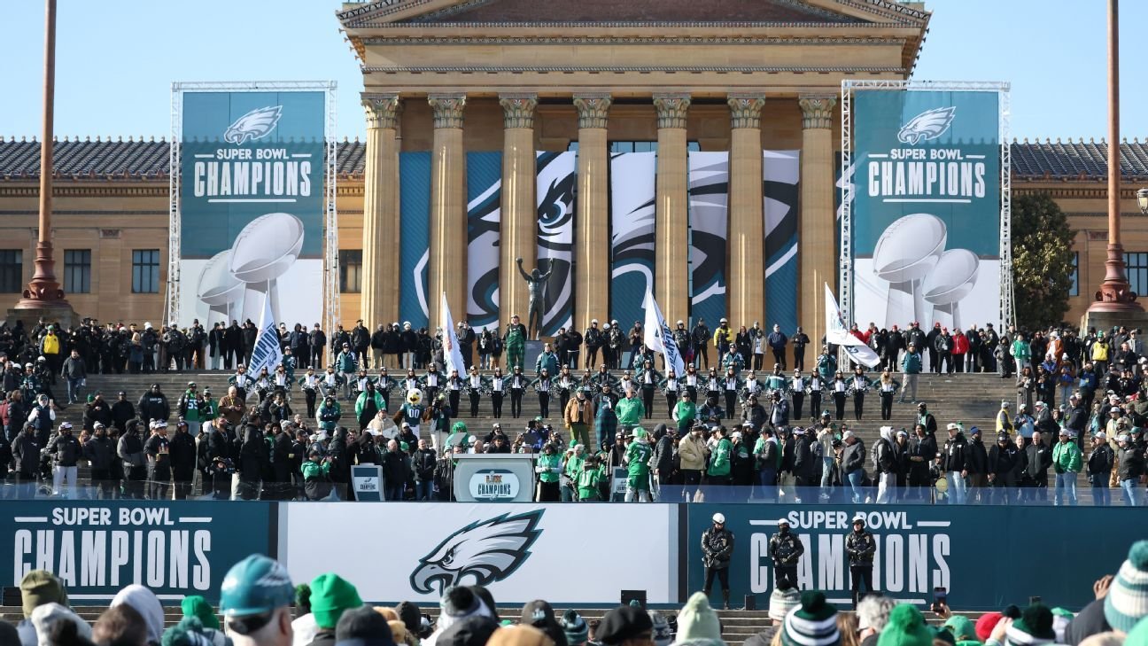 Many fans camped out along the parade route overnight, huddling under blankets and in tents to secure prime spots near the Philadelphia Museum of Art, where the Eagles took the stage on the “Rocky” steps.